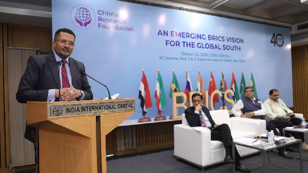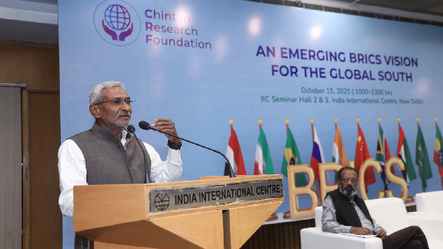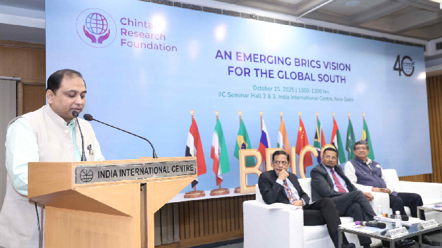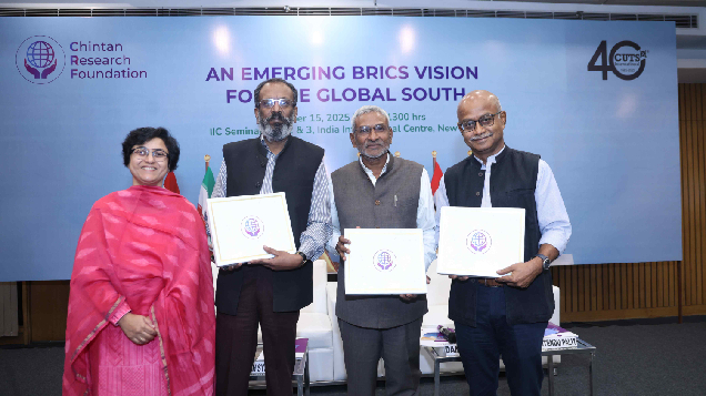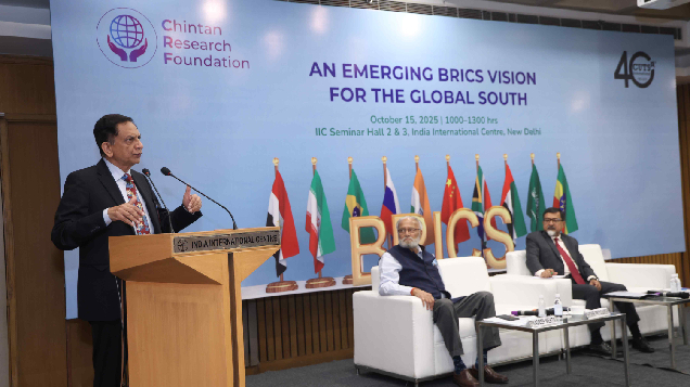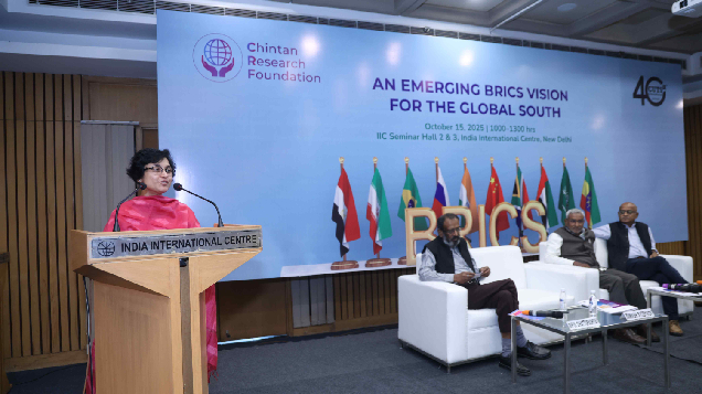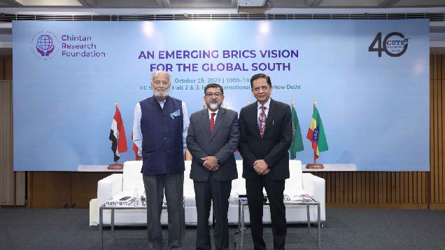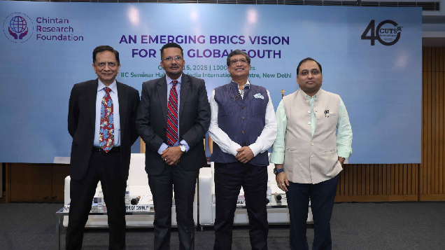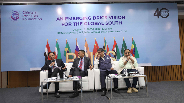 In anticipation of India’s BRICS presidency in October 2026, the Chintan Research Foundation, in collaboration with CUTS International, convened a symposium titled “An Emerging BRICS + Vision for the Global South.” The forum brought together diplomats, policymakers, and scholars to reassess India’s role within the BRICS framework and explore prospects for revitalizing intra-BRICS cooperation. Taking place shortly after the 17th BRICS Summit in July 2025, the dialogue examined the evolving dynamics of bilateral and multilateral relations amid India’s cautious foreign policy recalibration, offering nuanced insights into opportunities, challenges, and strategic pathways shaping the future of BRICS engagement.